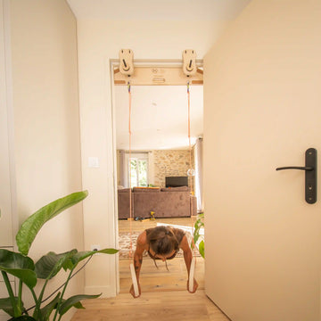 The SandwichBase is the clever way to install a traininghangboard without drilling walls. Its wood + steel system exploits thearc-boutement: once clamped in your doorframe, the support is stable and secure, even for dynamic pull-ups.